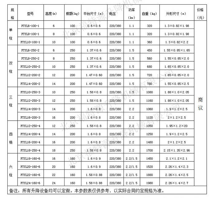 ▍鋁合金升降機(jī)常規(guī)參數(shù) / Product Parameter