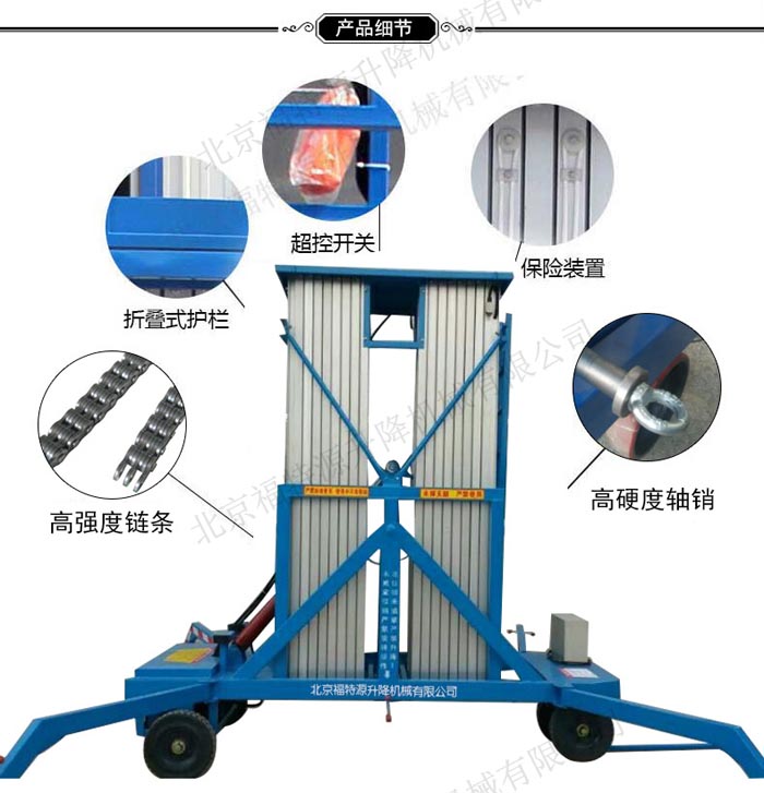 通常有單柱、雙柱、三柱、四柱、六柱等形式,根據(jù)需要可以加裝輔助行走裝置,為了放過通過低矮的通道可以定做為可斜式,還可以安裝到汽車、電瓶車等方便高空作業(yè)使用。